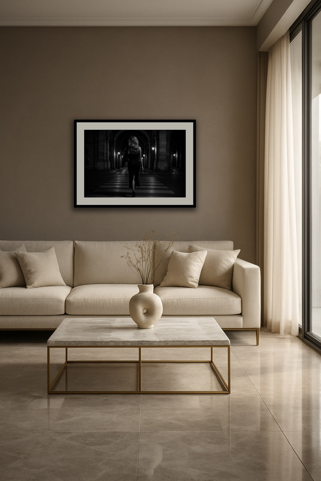 Ett elegant svartvitt fotografi som fångar en kvinna bakifrån när hon går över ett övergångsställe i natten. Hennes svarta klänning, höga klackar och läderjacka slängd över axeln utstrålar självsäkerhet, mystik och tidlös noir-elegans. Perfekt för moderna, minimalistiska miljöer som vill förmedla en känsla av styrka, sofistikation och filmisk dramatik.