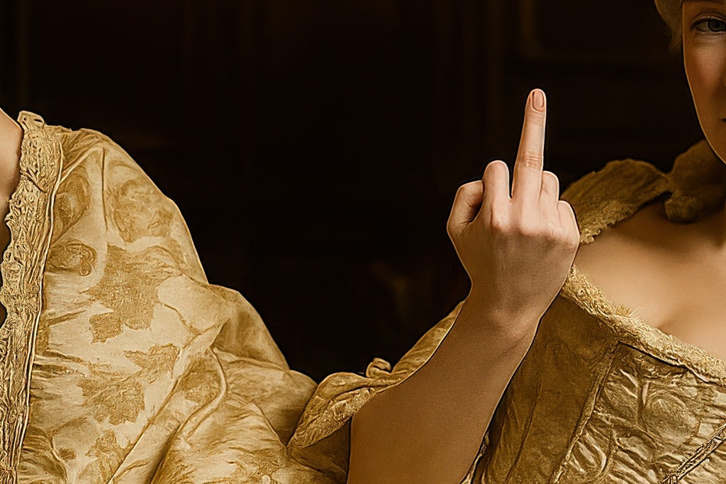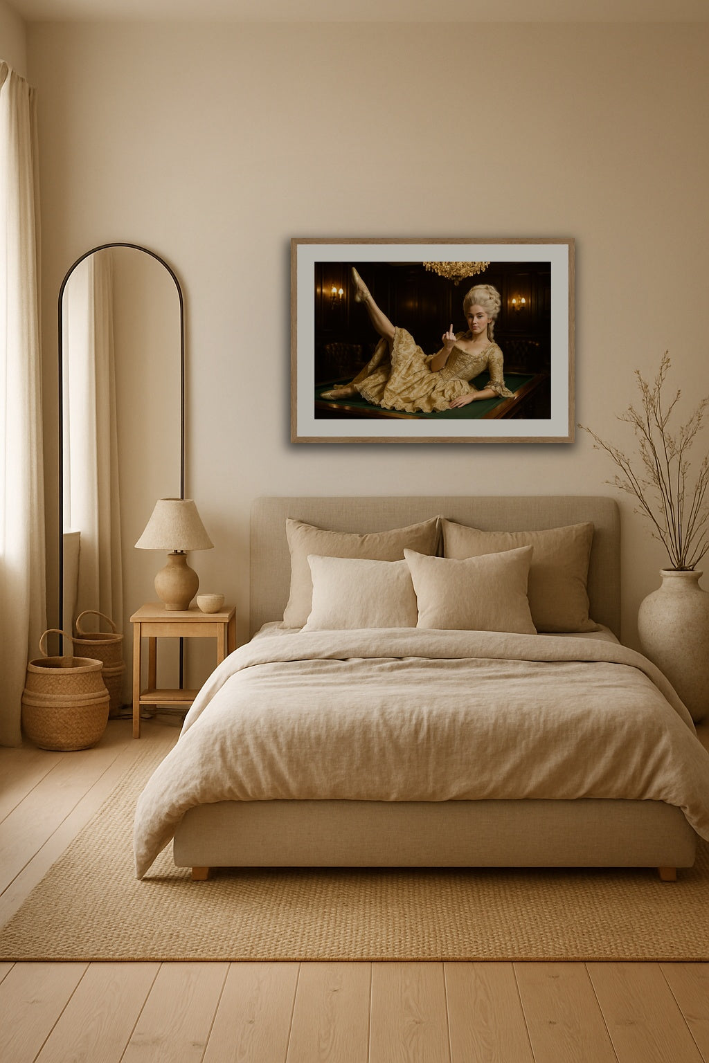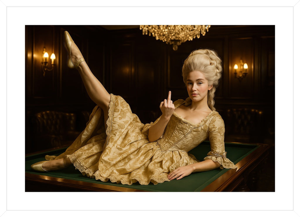 Detta lekfulla men samtidigt majestätiska porträtt visar en kvinna i en praktfull gyllene klänning med pudrat hår, liggandes avslappnat och görandes en rebellisk gest. Bilden kombinerar klassisk aristokratisk stil med djärv modern attityd – perfekt för eklektiska miljöer som vill väcka uppmärksamhet och skapa samtal.